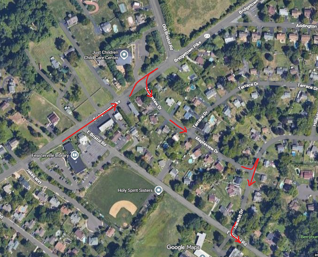 The beams will be brought up Bridgetown Pike and up to Mapleview Drive. Stop traffic (momentarily) on Bridgetown Pike and have the trucks back down Maple, on to Delwhit Dr. Then pull forward and turn right onto Bristol, where they will navigate to the project site.