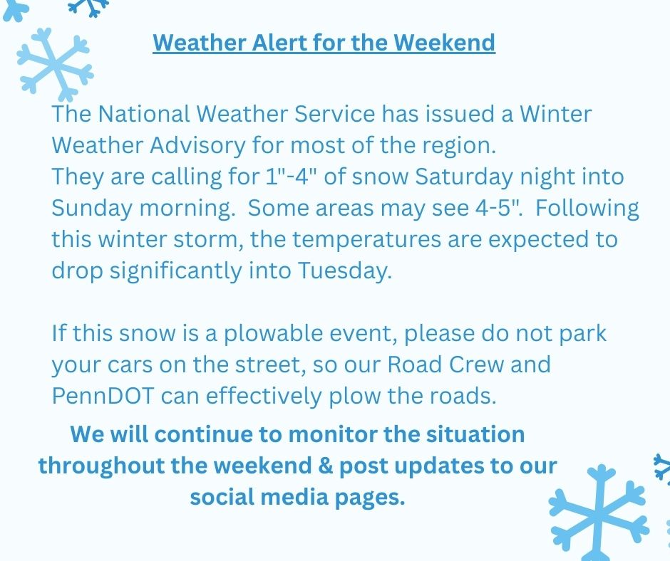 We need the vehicles off the street so our Road Crew and PENNDOT can effectively plow your streets.