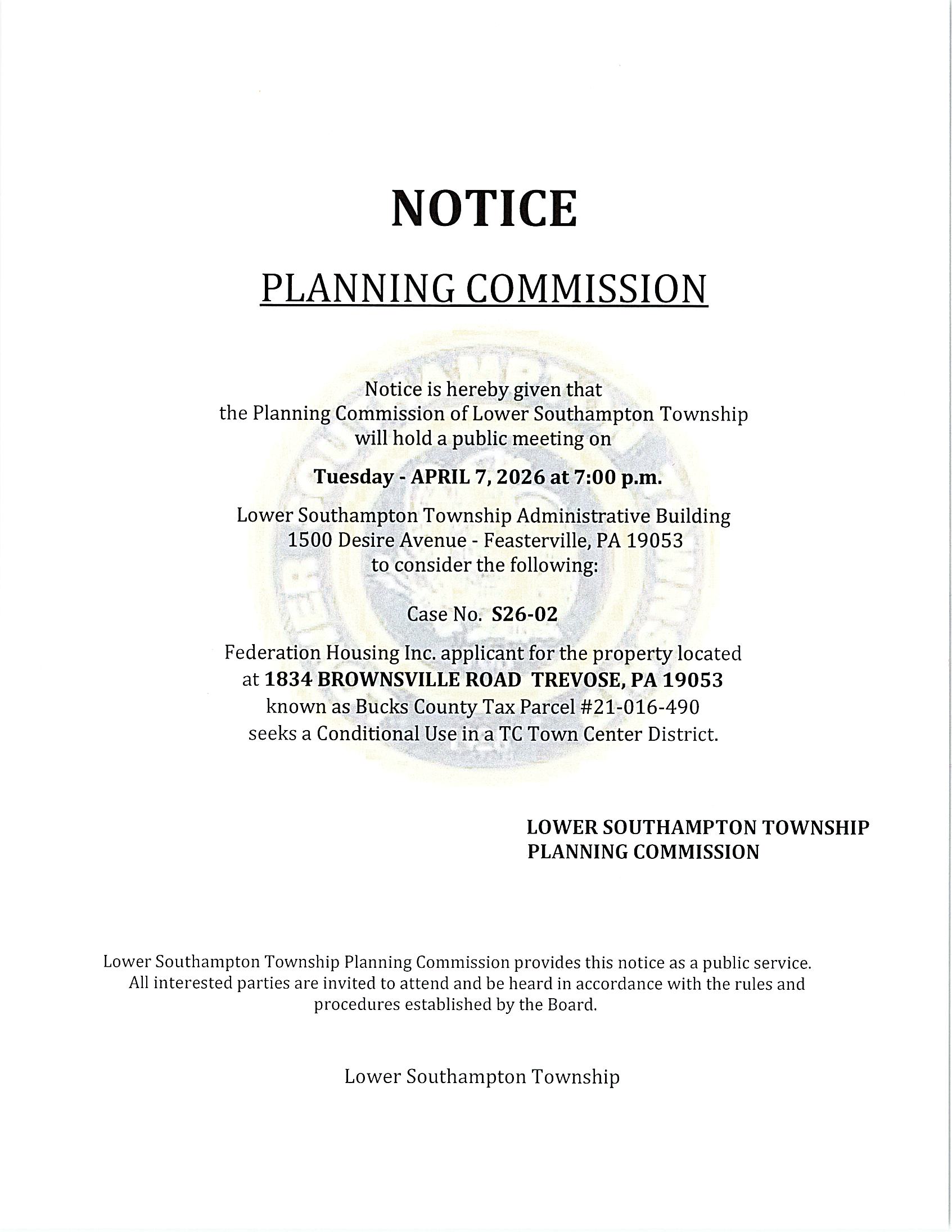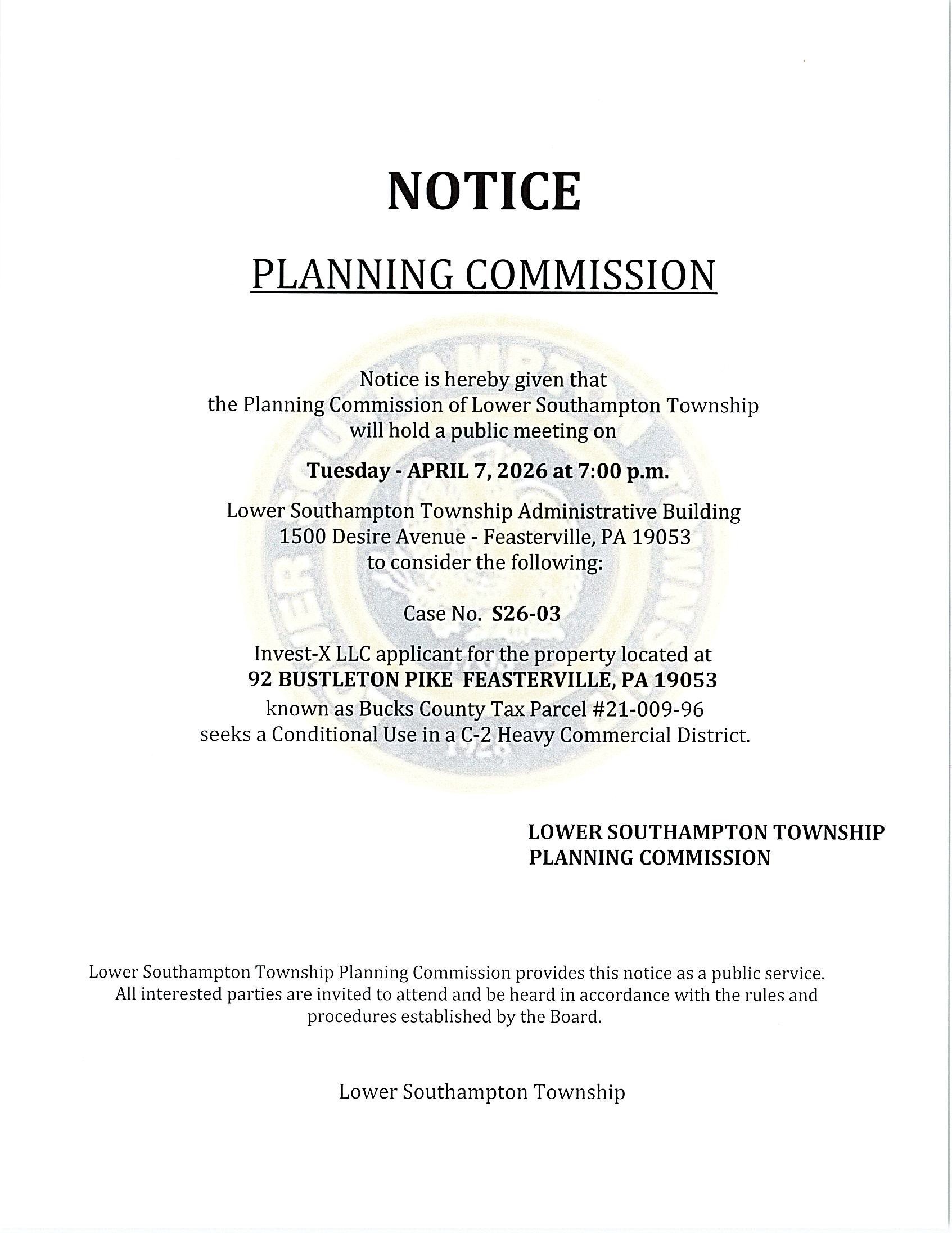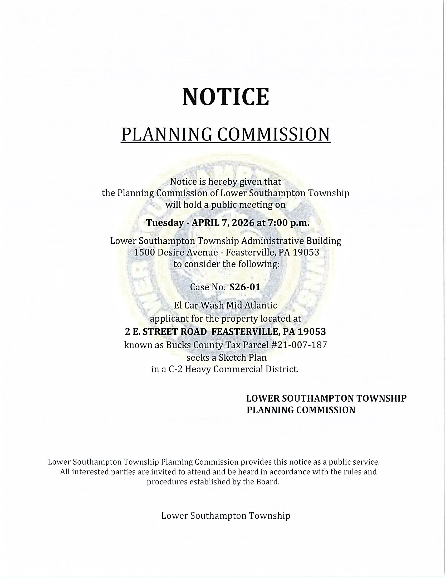 Planning Commission – Click here to view the Notices Home / Events / Date April 7, 2026 Time 7:00 pm Township Building 1500 Desire Ave Feasterville, PA 19053