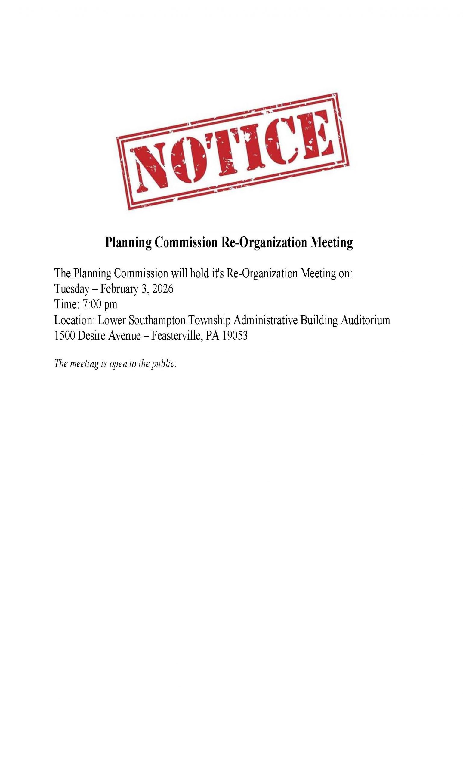 Planning Commission Meeting – Reorganization Meeting Home / Events / Date February 3, 2026 Time 7:00 pm Township Building 1500 Desire Ave Feasterville, PA 19053