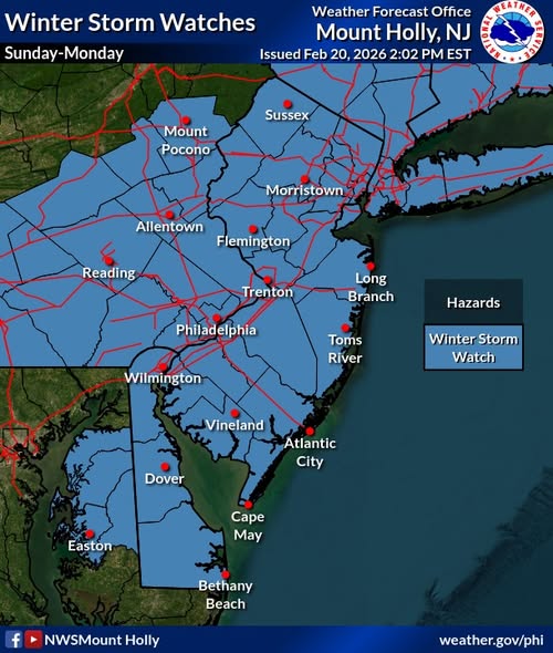 The National Weather Service has issued a Winter Storm Watch for much of the region for Sunday into Monday. Widespread snowfall of 5″ or more is possible.